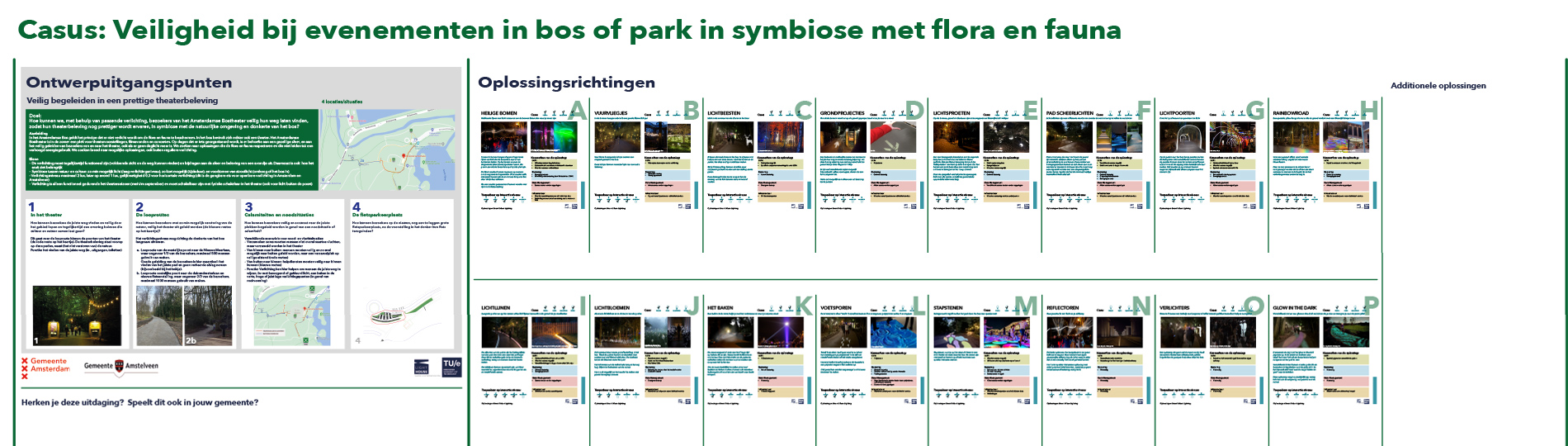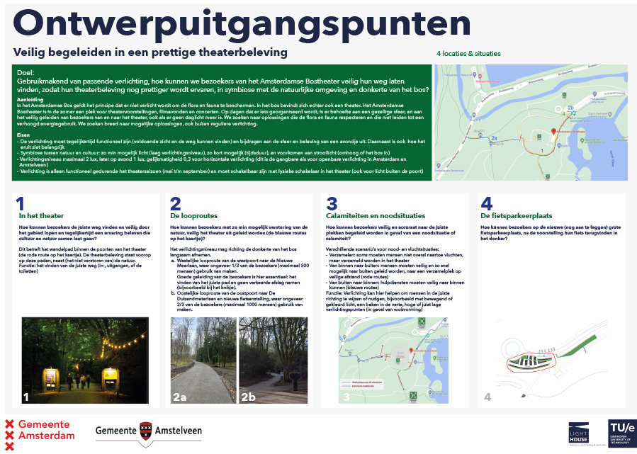 In het Amsterdamse Bos geldt het principe dat er niet verlicht wordt om de flora en fauna te beschermen. In het bos bevindt zich echter ook een theater. Het Amsterdamse Bostheater is in de zomer een plek voor theatervoorstellingen, filmavonden en concerten. Op dagen dat er iets georganiseerd wordt, is er behoefte aan een gezellige sfeer, en aan het veilig geleiden van bezoekers van en naar het theater, ook als er geen daglicht meer is. Hoe kunnen we bezoekers van een evenement in een bos of park veilig hun weg laten vinden, in symbiose met de natuurlijke omgeving en donkerte van het bos?