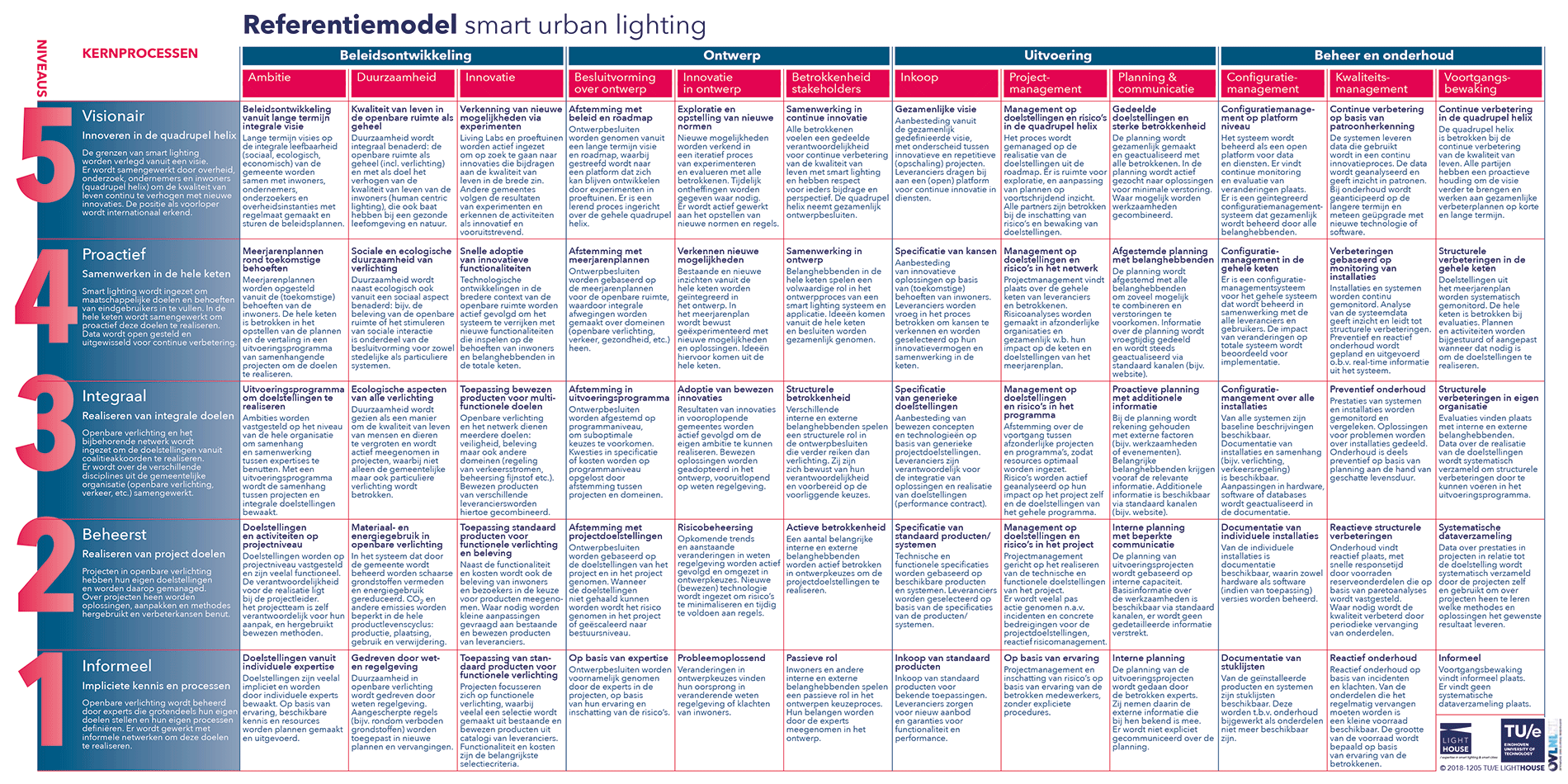 Smart Urban Lighting Gemeentes zien kansen om met nieuwe slimme licht technologieën de kwaliteit van leven te verbeteren. Ondertussen ontwikkelen deze technologieën zich snel, en worden gemeentes geconfronteerd met een snel veranderend en groeiend aanbod van nieuwe producten, oplossingen, diensten en verdienmodellen. Ze ervaren dat het moeilijk is om de juiste beslissingen te nemen, waarin de kosten, duurzaamheid en maatschappelijke waarde voor de korte en langere termijn worden meegenomen. De snelheid waarmee goede en zinvolle stappen kunnen worden gezet neemt toe als gemeentes informatie en successen kunnen delen in de transitie van oud naar nieuw. Hoewel elke gemeente anders is, is er grote overeenkomst in de uitdagingen. Zeker wanneer de besluitvormingsprocessen worden doorgrond en gedeeld, kan veel van elkaar worden geleerd. Gemeentes staan er dan niet meer alleen voor, maar kunnen doorbouwen op de resultaten van anderen. Niet alle gemeentes hebben dezelfde ambitie en mogelijkheden. Sommigen willen graag vooroplopen en innovatieve oplossingen toepassen, waar anderen liever minder risico lopen. LightHouse heeft een referentiemodel voor smart urban lighting ontwikkeld. Gemeentes kiezen een ambitieniveau en gebruiken het model om hun huidige manier van werken te analyseren en krijgen inzicht in mogelijke verbeteringen. Het model laat praktische manieren zien om hun ambitie te bereiken. Gemeentes kunnen ook een andere gemeente kiezen voor een uitwisseling van manieren van werken. Op de hogere ambitieniveaus is ook samenwerking met andere organisaties nodig: publieke organisaties, bedrijven, kennisinstellingen en inwoners. Het referentiemodel biedt een gemeenschappelijke taal en raamwerk om deze samenwerking in de quadruple helix te ondersteunen. |