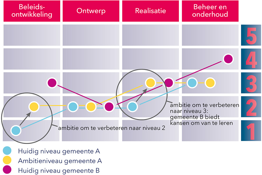 Om (zelf)evaluatie en vaststelling van ambitieniveaus te vereenvoudigen is een excel tool ontwikkeld. Via vragenlijsten wordt een evaluatie van de huidige situatie gemaakt. Wanneer alle vragen zijn beantwoord wordt de score vastgesteld en gevisualiseerd op het model. Daarbij kan het zijn dat op sommige onderdelen lager gescoord wordt en op andere hoger. In de visualisatie wordt daarom een gemiddelde score gegeven, maar ook de minimum en maximum score. Daarmee wordt zichtbaar dat op sommige onderdelen nog verbetering mogelijk is, maar ook waar de bestpractices zitten. Het tool biedt ook de mogelijkheid om een ambitieniveau aan te geven voor de kortere en langere termijn. Deze worden dan ook zichtbaar in de visualisatie. |
