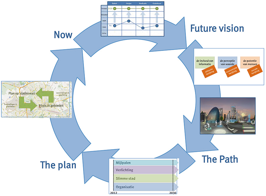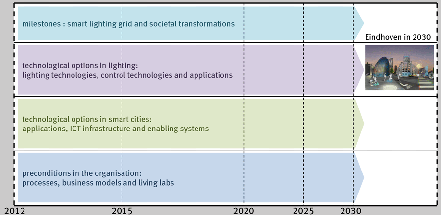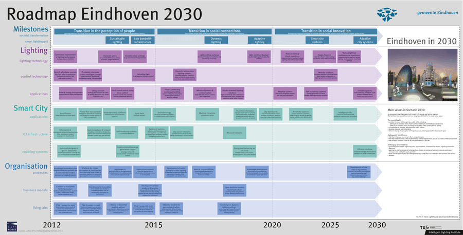 Vision and Roadmap The approach consisted of a number of steps. First of all the current ways of working, as well as the ambition level of the municipality are analysed. The Future Telling research method is applied to identify the most important drivers for change towards a livable cities in the coming 20 years. These drivers are then used to define a desired scenario for the city of Eindhoven in 2030. In a roadmap research the developments in lighting and smart city technologies are identified to realise the scenario, along with the organisational preconditions to achieve the ambition. These insights are subsequently used to define an innovation plan for the city with concrete steps to realise the ambition through public-private collaborations. |