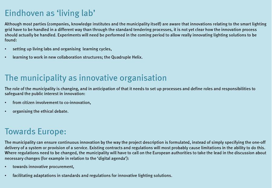 It became clear that the ambition level of Eindhoven is to become a visionary leader in urban lighting. This vision includes collaboration in a quadruple helix structure (with the municipality, business parties, research institutes and citizens as equal partners) to realise innovative lighting solutions that contribute to the quality of life in the city. Explorations with innovative lighting solutions will take place in (temporary) living labs and should contribute to the development of the city in becoming a hotspot for lighting innovation. The local council will face a changing role. From a lead user that offers the city as a test bed to suppliers, via a provider of infrastructure as enabler for innovation, to a full partner in an innovation collaboration that safeguards the public interest through citizen involvement in the innovation process. |