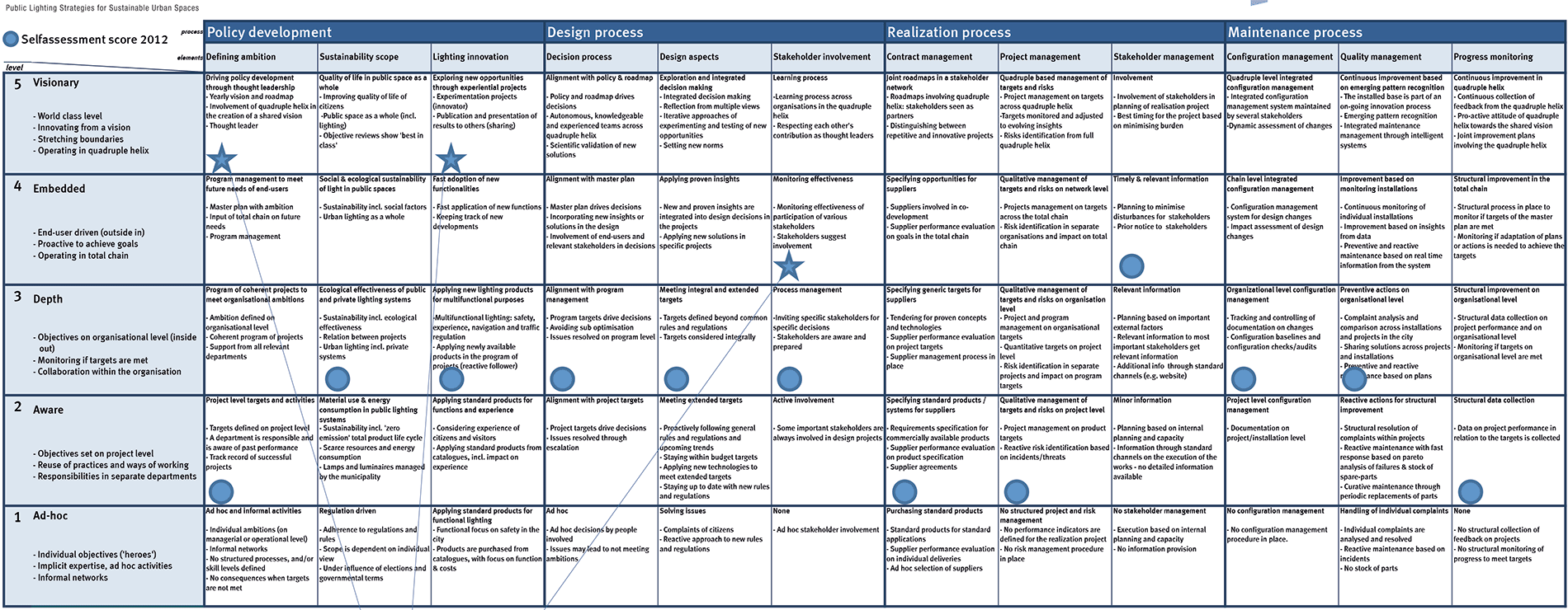 Now: defining ambition First the current situation and ambition level of the city of Eindhoven is defined. In this process the ILI Reference Model for Sustainable Urban Lighting is used to plot the results of the self-assessment and deep dive from the PLUS project. In a workshop the ambition level for the longer and shorter term is discussed. |
