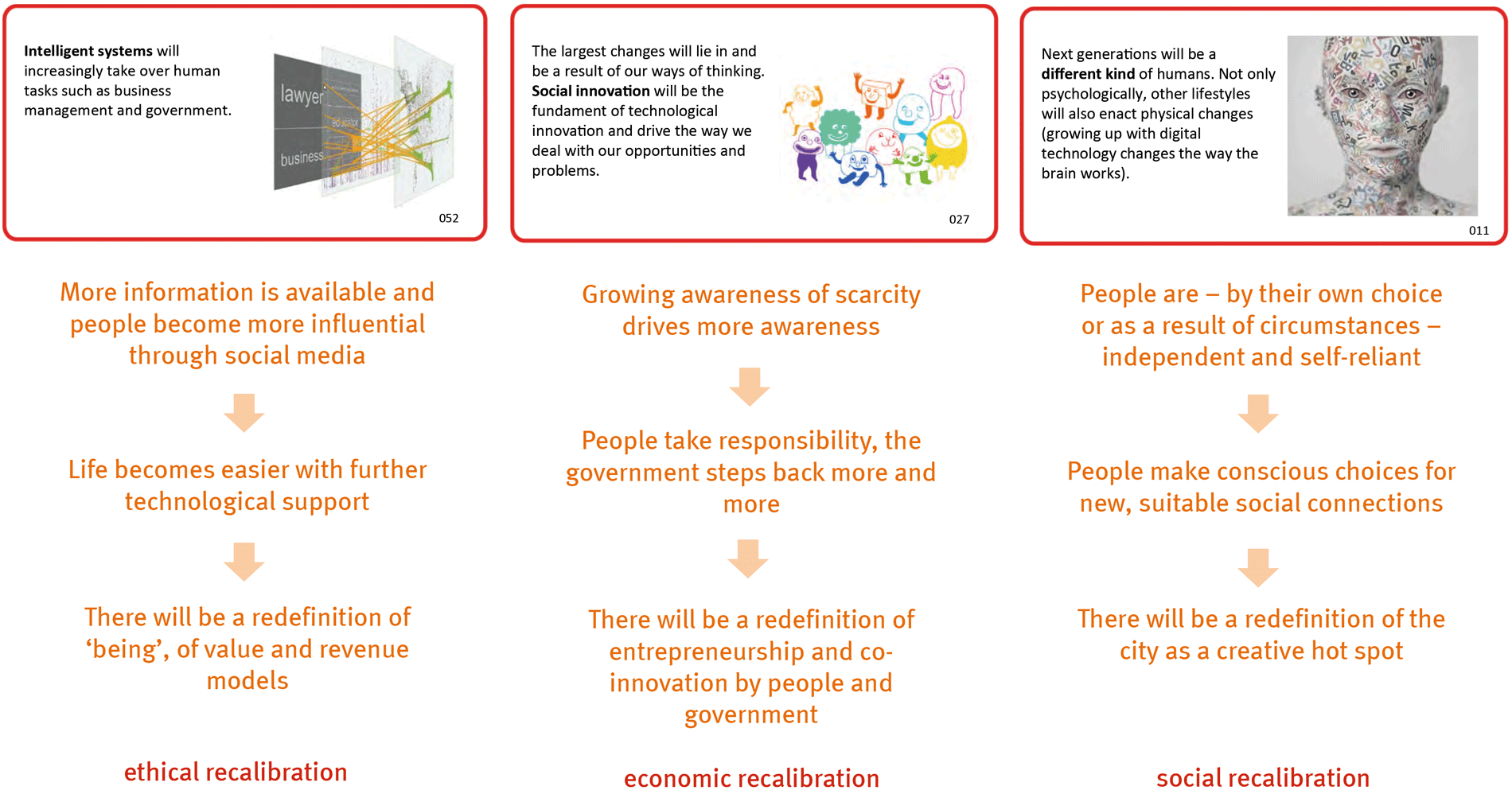 Future Vision: Scenario Eindhoven 2030 In the next step a vision on the future is explored. With the Future Telling research method 12 experts from industry, knowledge institutes and government are invited to select the top 10 global trends with major impact and discuss their view on how these will influence life in the city in 2030. The analysis of the results of the interviews revealed three drivers for change:
