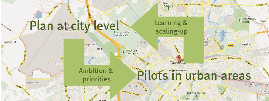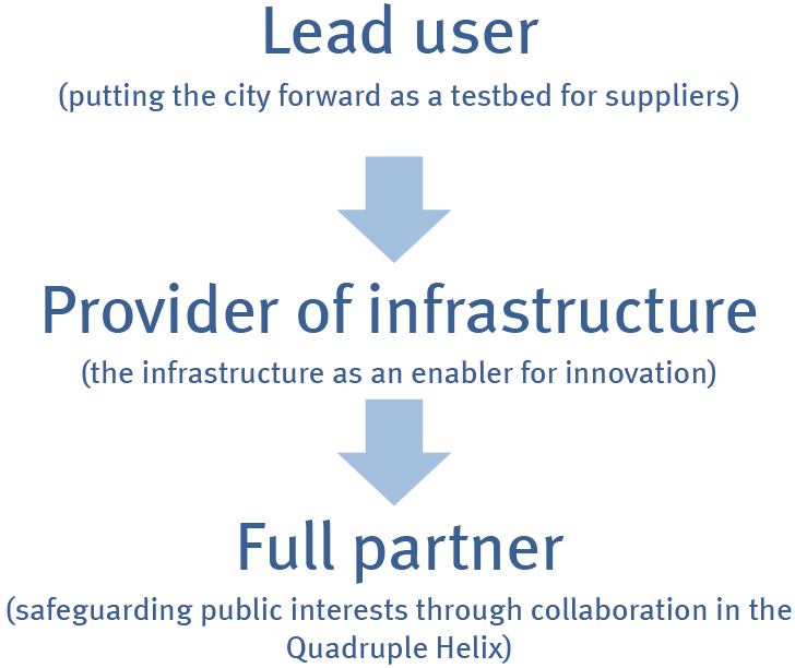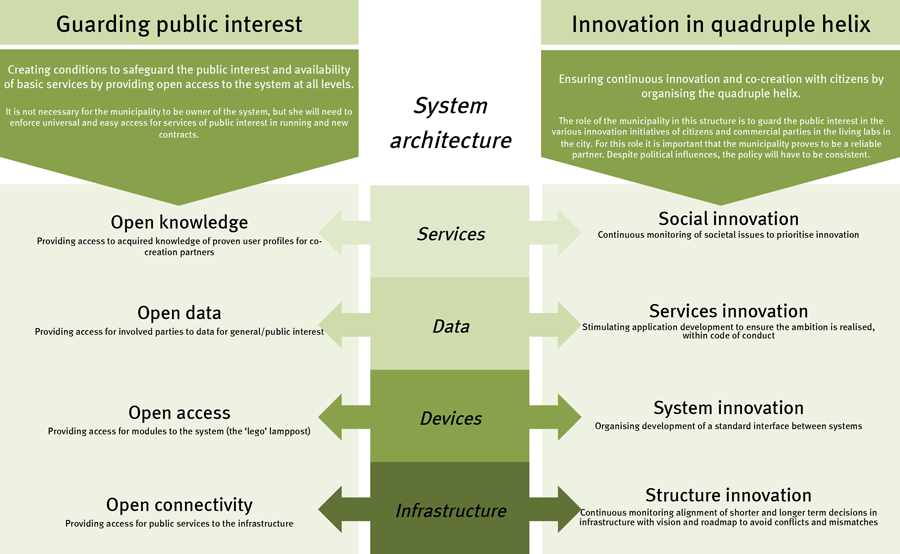 The municipality will have an important role to establish the preconditions for innovation. This includes the safeguarding of public interest and availability of the basic services by providing open access to the system at all levels: connectivity to the infrastructure for public services, access to the devices, access to data for public interest and access to acquired knowledge. It also includes ensuring continuous innovation and co-creation with citizens by organising the quadruple helix to innovate at all levels of the system: innovations in the infrastructure, innovations in the system of devices and developing a standard interface, innovation in services to drive development of new applications, and social innovation to prioritise societal challenges and issues that are deemed important by the citizens. The concrete steps to be taken on the short term then involve the creation of a plan on city level that indicates ambitions and priorities. In parallel pilots can be done in specific city areas that provide a learning platform and scalability. Concrete actions include the installations of living labs in the city, the change towards an innovative organisation and taking the lead to organise required preconditions on European level. In the coming years the municipality will have to develop its role from lead user to full partner in the quadruple helix. This also means that all partners will have to embrace mutual dependency in collaborative innovation and learning-by-dong. The municipality will have to take the lead in this transition to guard the openness in the collaboration agreements and to ensure the public interest is safeguarded. |