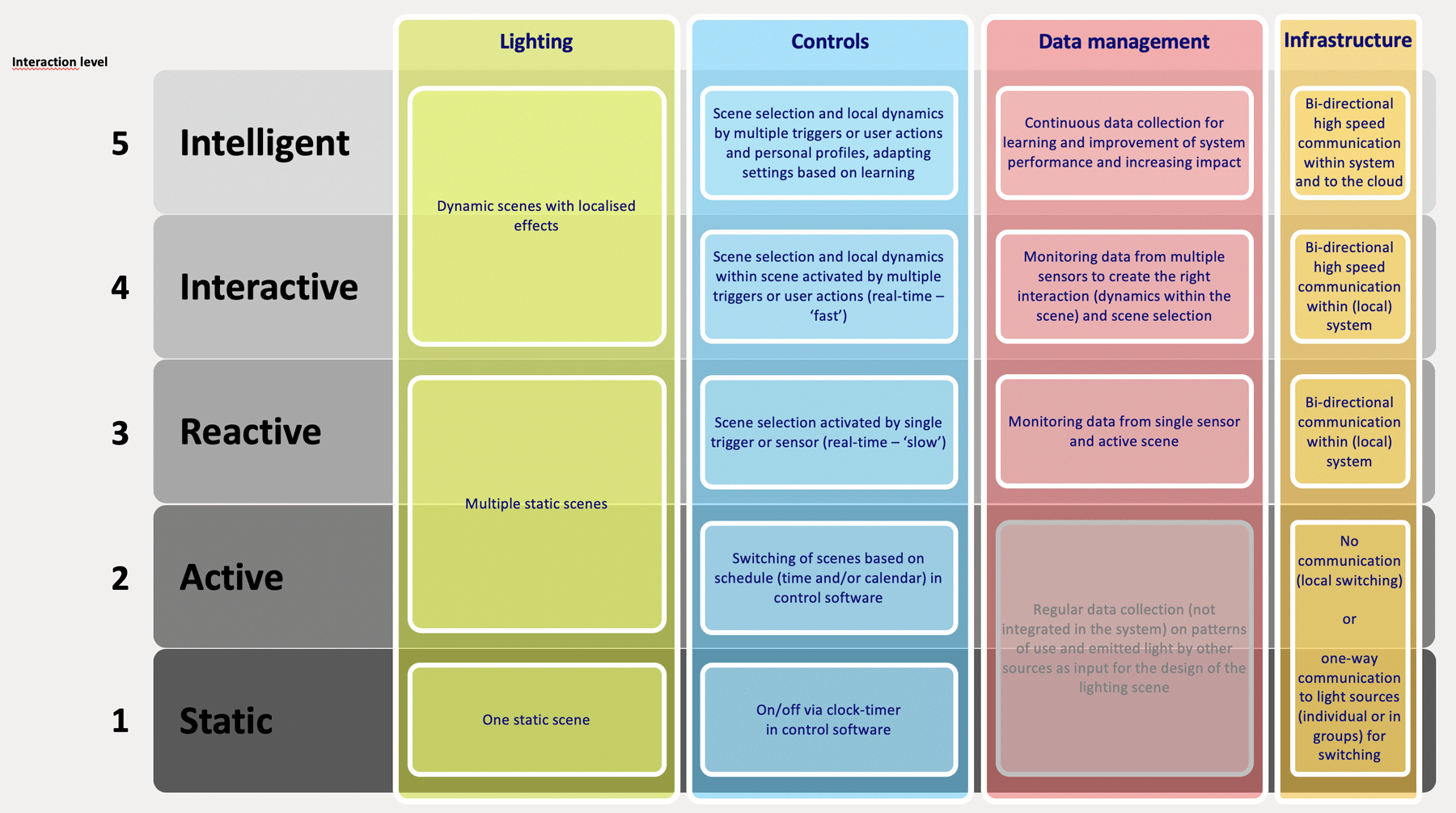 Identified use cases for smart lighting in the pilot area. A typology for the smart lighting system on different interaction levels. |