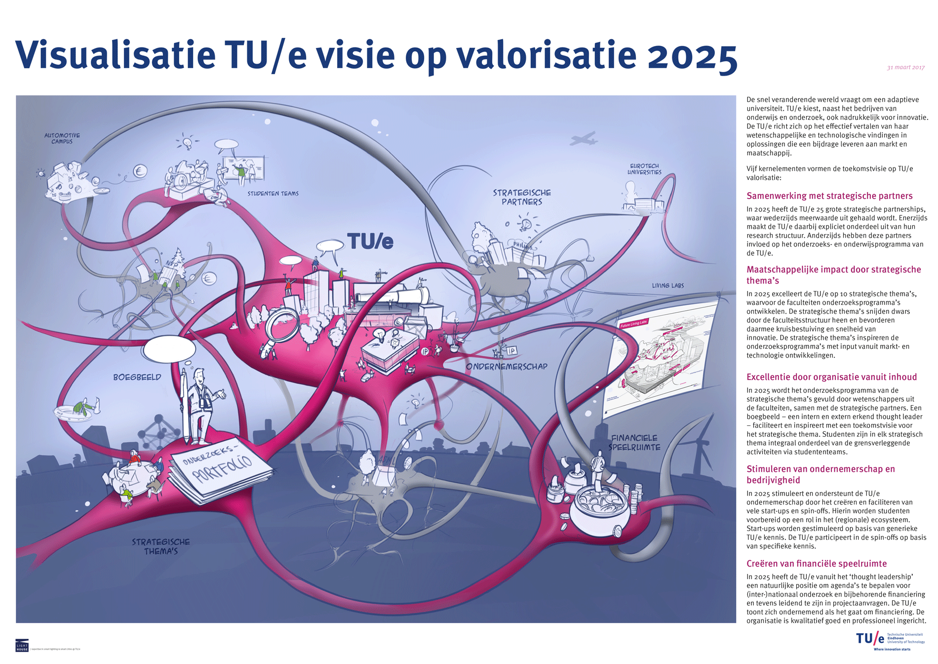 LightHouse developed a vision and roadmap for the development of a collaborative ecosystem for university, industry, government and start-ups. Today's world demands an adaptive university that seeks and cultivates cooperation with industry and government organisations. In addition to the operation of education and research, the TU/e warmly embraces innovation. The TU/e aims for effectively translating scientific discoveries and technological solutions that contribute to the market and society. The role of the TU/e in society and in partnerships is changing. Valorisation is the key here. Therefore, there is a need for a vision and roadmap for valorisation face these changes. |