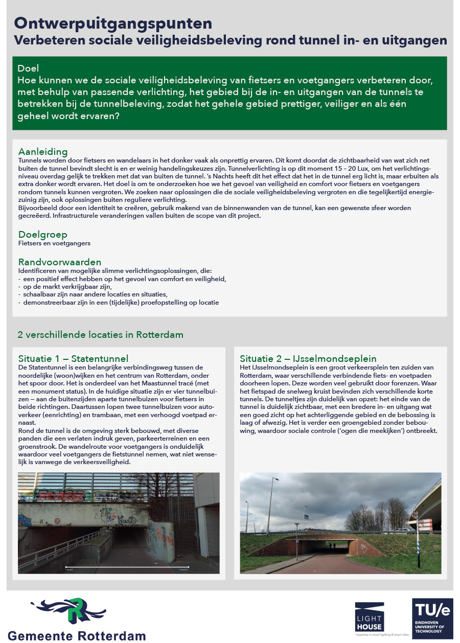 Hoe kunnen we de sociale veiligheidsbeleving van fietsers en voetgangers verbeteren door, met behulp van passende verlichting, het gebied bij de in-en uitgangen van de tunnels te betrekken bij de tunnelbeleving, zodat het hele gebied prettiger, veiliger en als één geheel wordt ervaren?